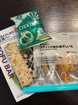 泳いだ後の栄養補給🏊 お豆腐バー、干し芋、チョコパイ(抹茶)😋